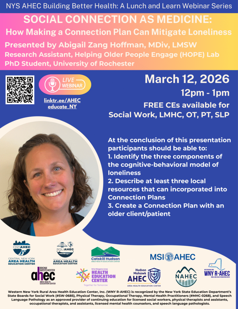 Join NYS AHEC for a Lunch and Learn webinar exploring social connection as a powerful tool to address loneliness among older adults. This interactive session will introduce the cognitive behavioral model of loneliness and demonstrate how Connection Plans can be used in practice to support social engagement, well being, and overall health. Participants will gain practical strategies and resources that can be immediately applied in clinical and community based settings.